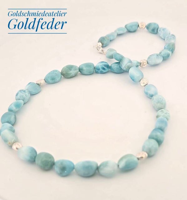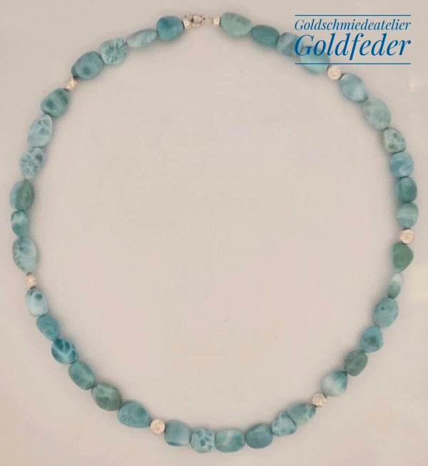 Wunderbar Sommerliche Larimar-Kette mit kleinen silbernen Schnecken als Hingucker.