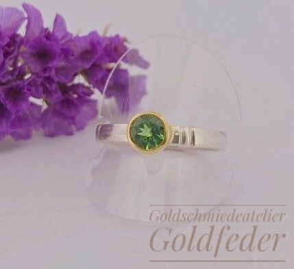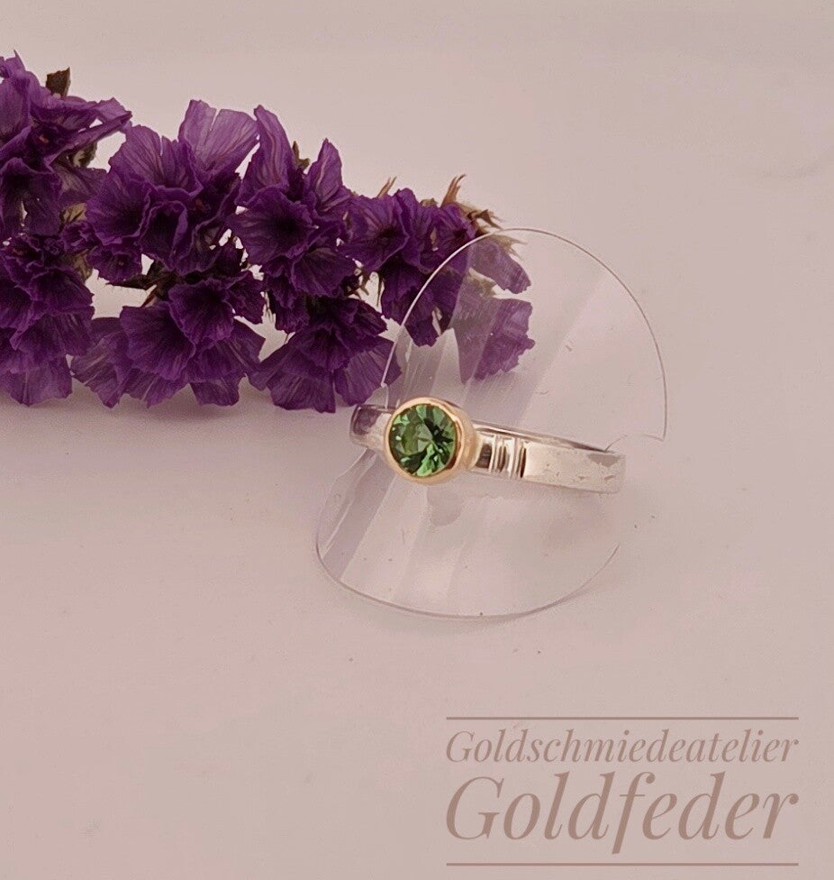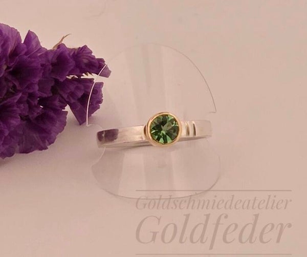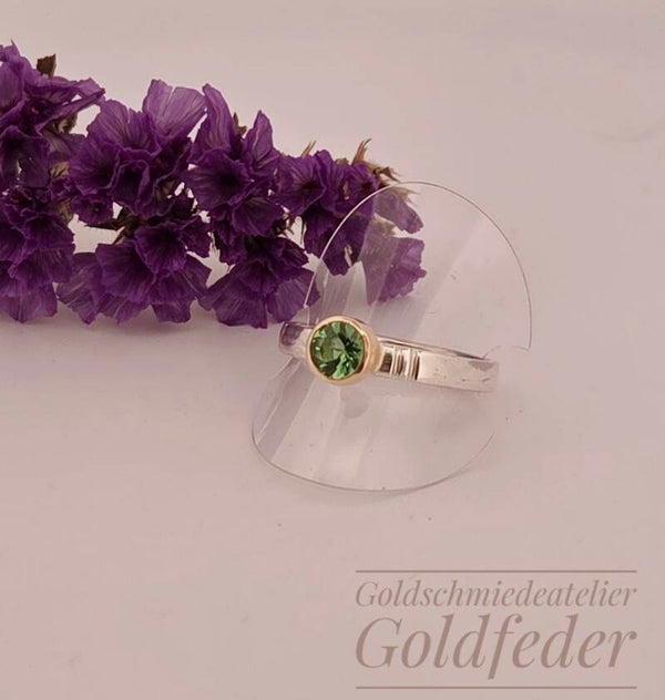 Toller Feiner Silberring mit einem strahlenden grünen Turmalin der in 750/- Gelbgold gefasst ist.